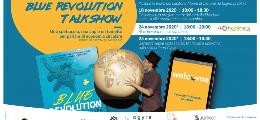 La graphic novel Blue Revolution, disegnata da Benni, edita da BeccoGiallo Editore a marzo 2020, sui testi di Alberto Pagliarino, Nadia Lambiase e Paolo Piacenza è lo spunto per un talk online che per quattro serate dall'11 novembre, all’ora dell’aperitivo, coinvolgerà tutti gli interessati a scoprire e conoscere meglio l’economia circolare. Blue Revolution Talk Show è ideato da Mercato Circolare e Pop Economix, BeccoGiallo Editore in partnership con il progetto Ecco (Economie Circolari di Comunità per la rigenerazione ambientale, sociale e culturale) di Legambiente. L’11 novembre 2020 dalle 18 alle 18.30 in diretta sulle pagine Facebook di Pop Economix, Mercato Circolare e del proget